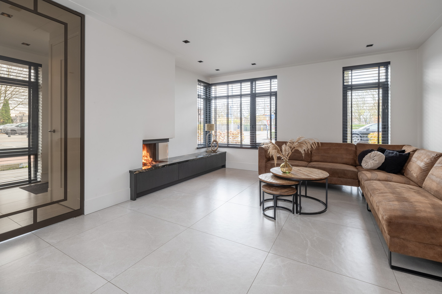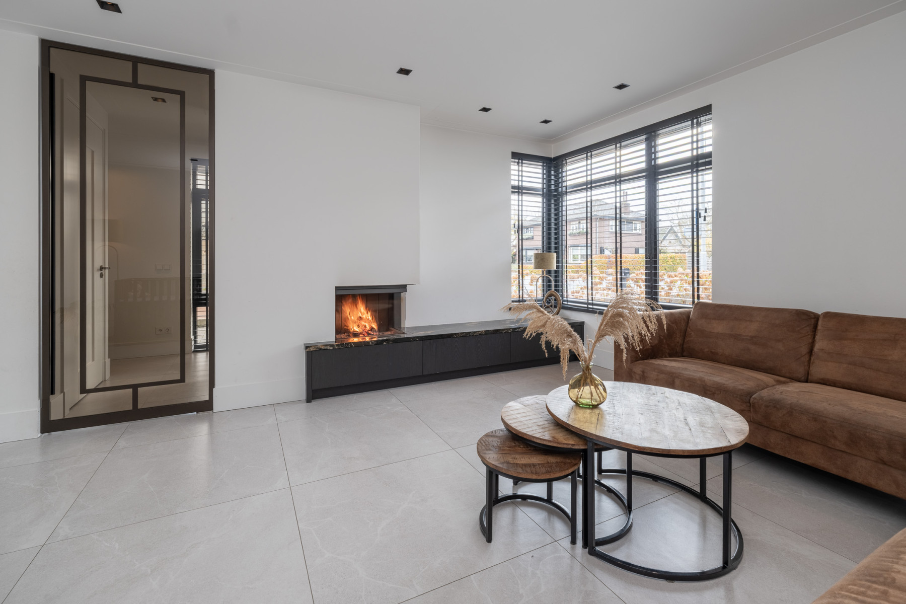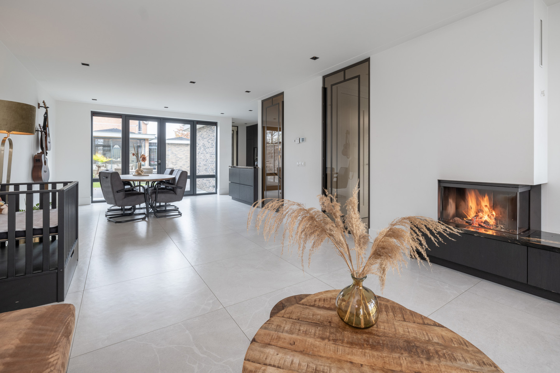 Deze woonkamer nodigt uit om op de bank te ploffen en te gaan genieten van uw (t)huis! De ruimte is strak afgewerkt met grote vloertegels en strakke wanden. Door het hoekraam en het andere raampartij komt er veel daglicht naar binnen. Tevens zorgen de raampartijen voor een levendig uitzicht. De open haard aan de zijkant maakt de ruimte compleet. Terwijl u op de bank of in de stoel een plekje gevonden hebt, geniet u van het knisperende vuur op de achtergrond. Het lage, donkere meubel geeft de kamer een moderne uitstraling. De bronze taatsdeuren naar de hal en het souterrain geven een luxe uitstraling en zorgen voor een verbinding tussen verschillende ruimtes.