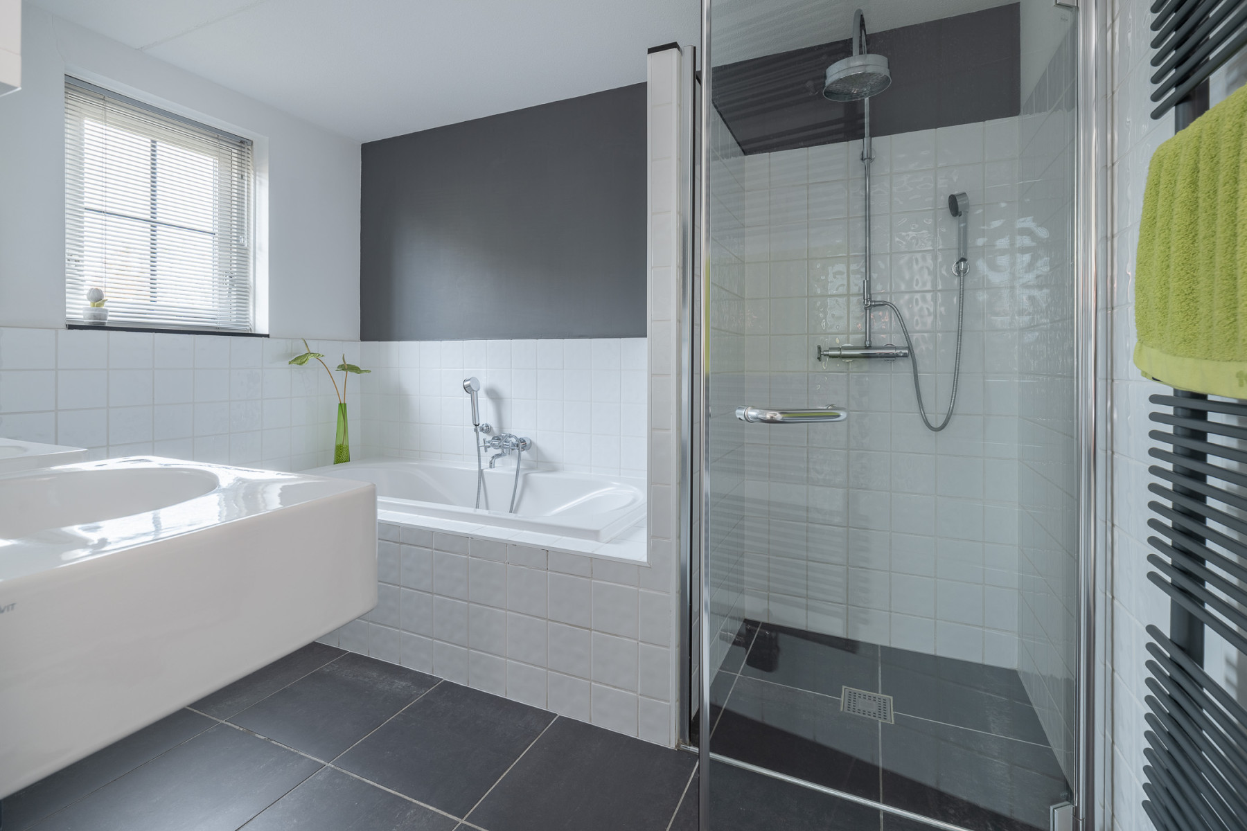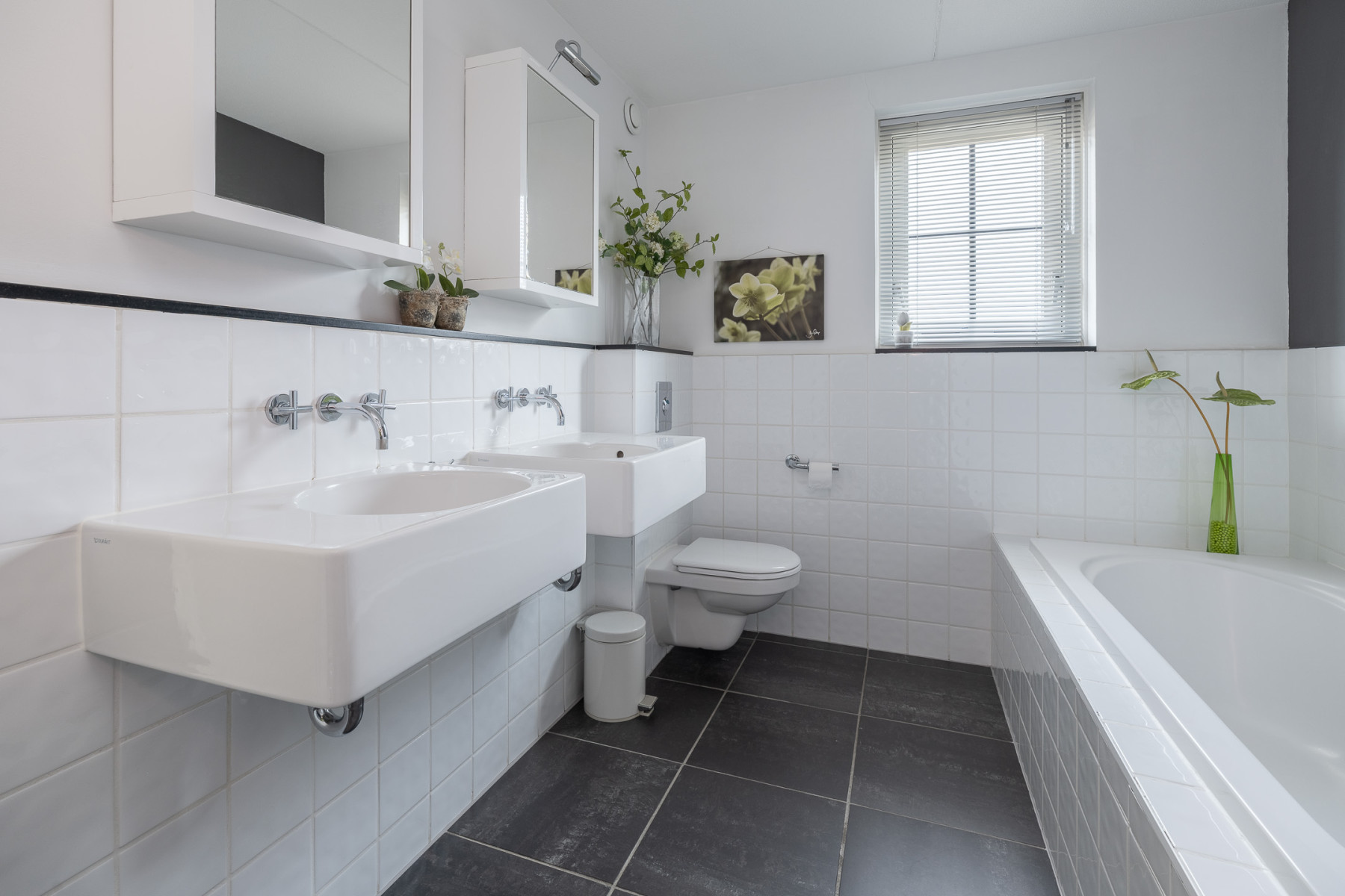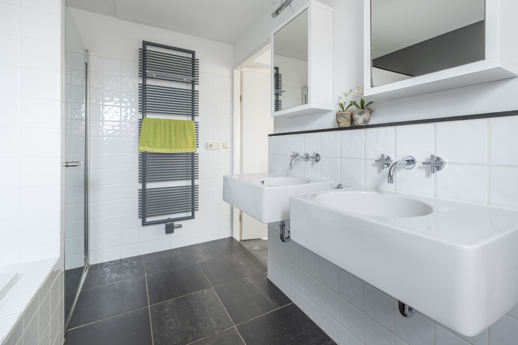 De badkamer is afgewerkt met lichte tegels op de wand en een donkere tegelvloer. Dit zorgt voor een stijlvol geheel. In deze ruimte beschikt u over een ligbad, douchecabine met regendouche, twee wastafels, designkranen, een toilet en een designradiator. Daarbij profiteert u in deze ruimte van vloerverwarming, ideaal zo blijft het altijd een aangename temperatuur. Een badkamer waar comfort en gemak de boventoon voeren.