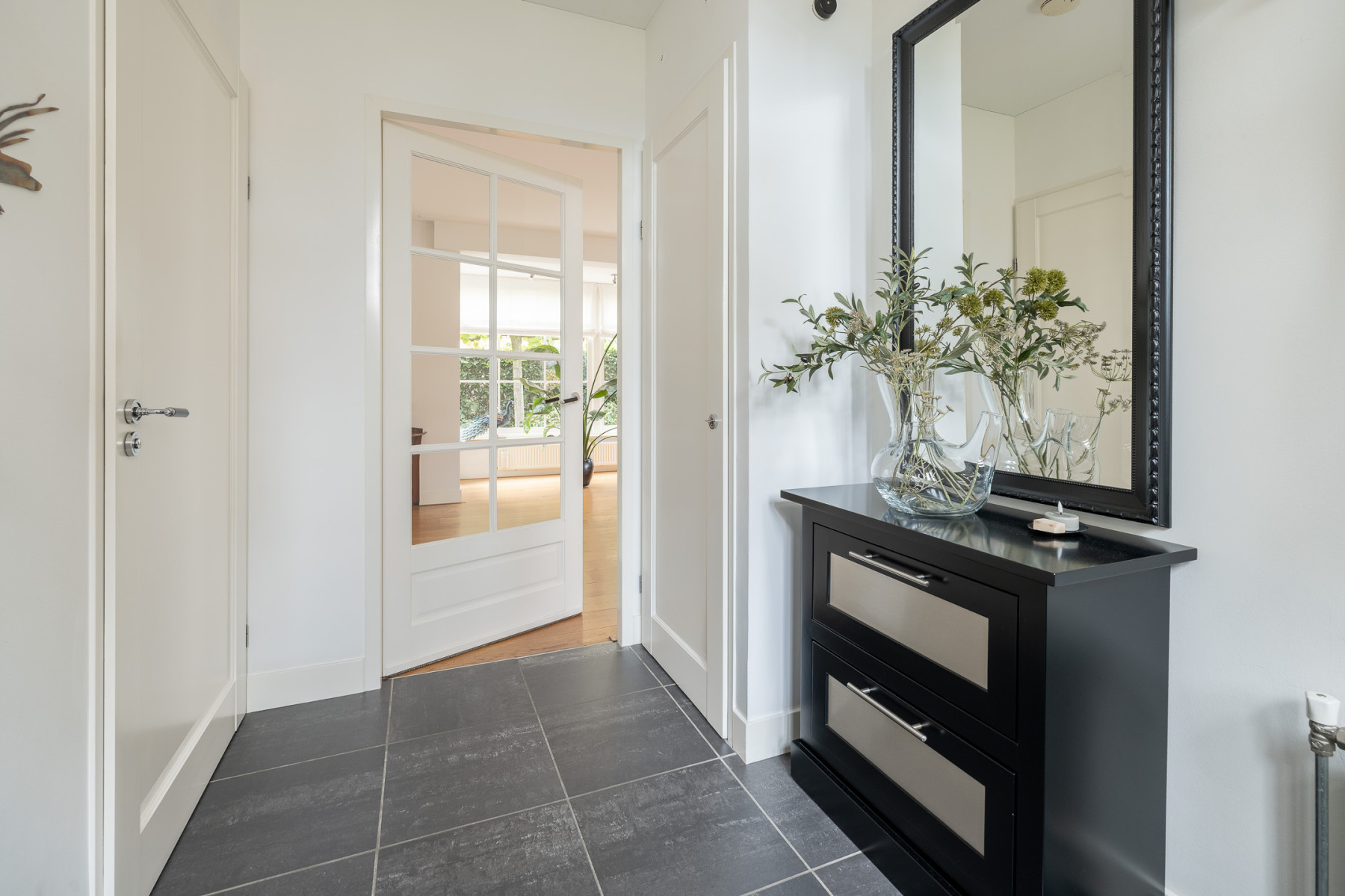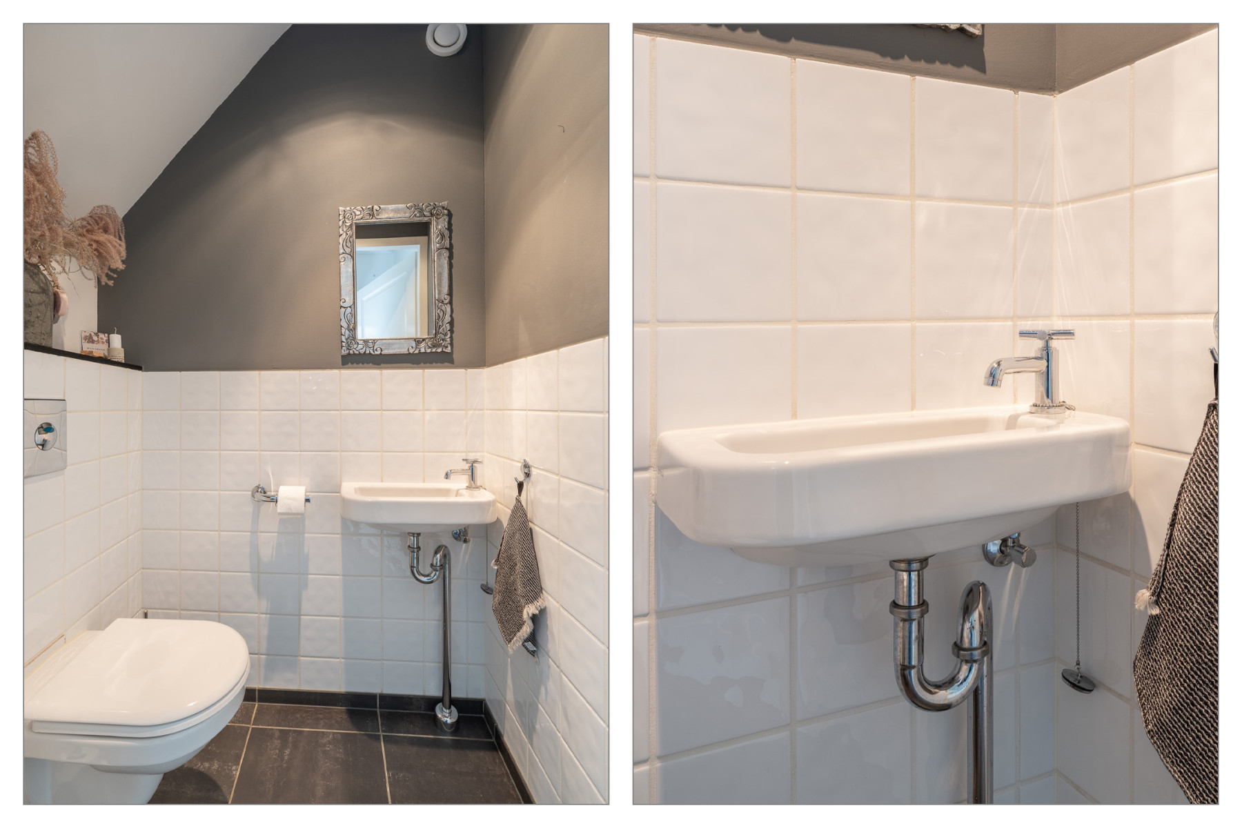 De woning stapt u binnen in de hal, die afgewerkt is met lichte wanden, een gestuukt plafond en een grijze tegelvloer. Gelijk rechts treft u de garderobe, vervolgens de meterkast en aan de linkerkant bevindt zich de trapopgang naar de eerste verdieping en een toiletruimte met toilet en fonteintje. Alles oogt verzorgd en praktisch, precies wat u in een entree zoekt. Een nette binnenkomst die meteen laat zien hoe goed deze woning onderhouden is.