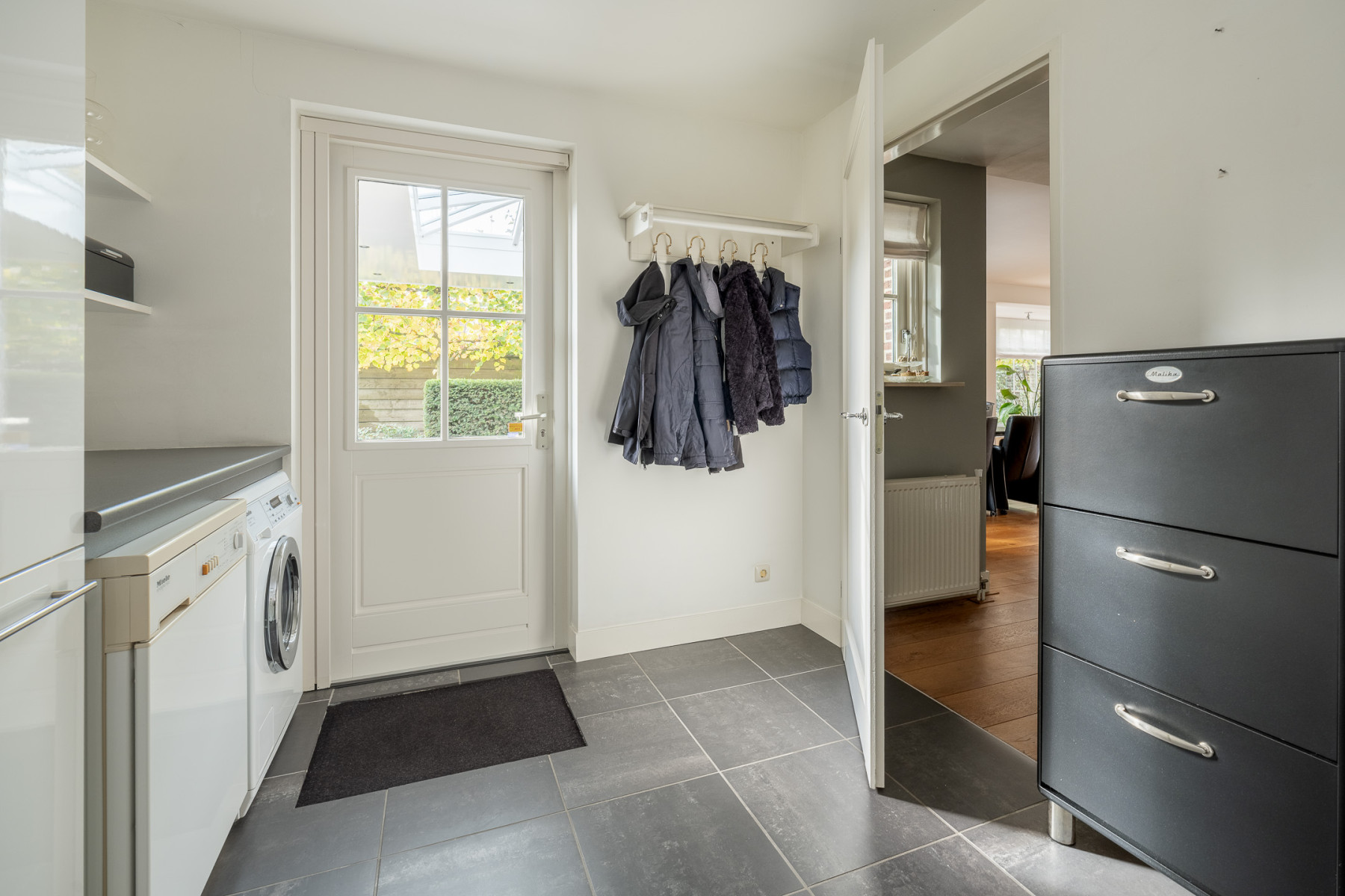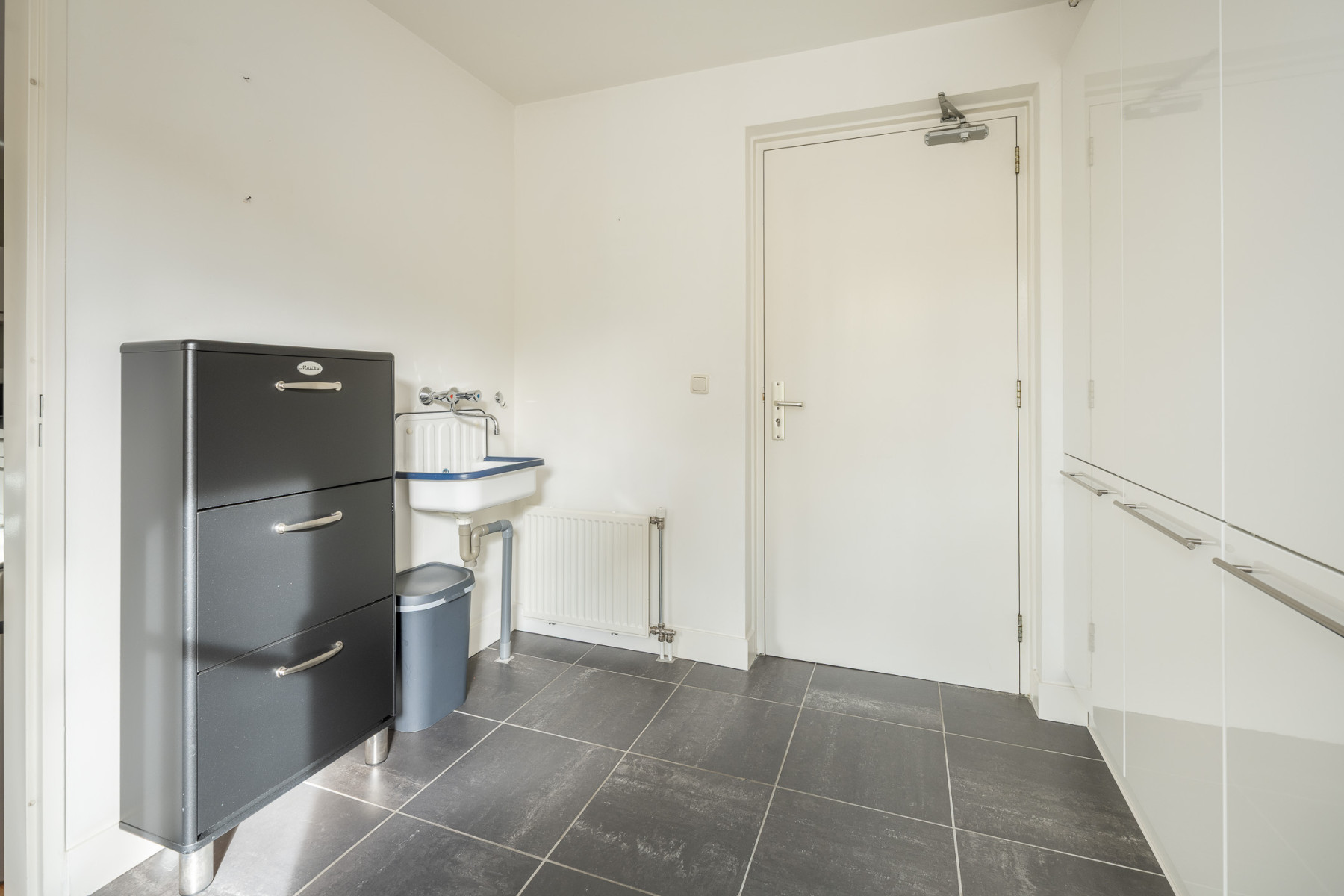 Een praktische bijkeuken zorgt ervoor dat u niet direct met uw vieze schoenen het leefgedeelte binnenstapt. In de bijkeuken bevindt zich de aansluiting voor de witgoedapparatuur met daarnaast een vaste kastenwand. Handig voor alle schoonmaakspullen en voorraad, zo blijft de ruimte netjes en opgeruimd.