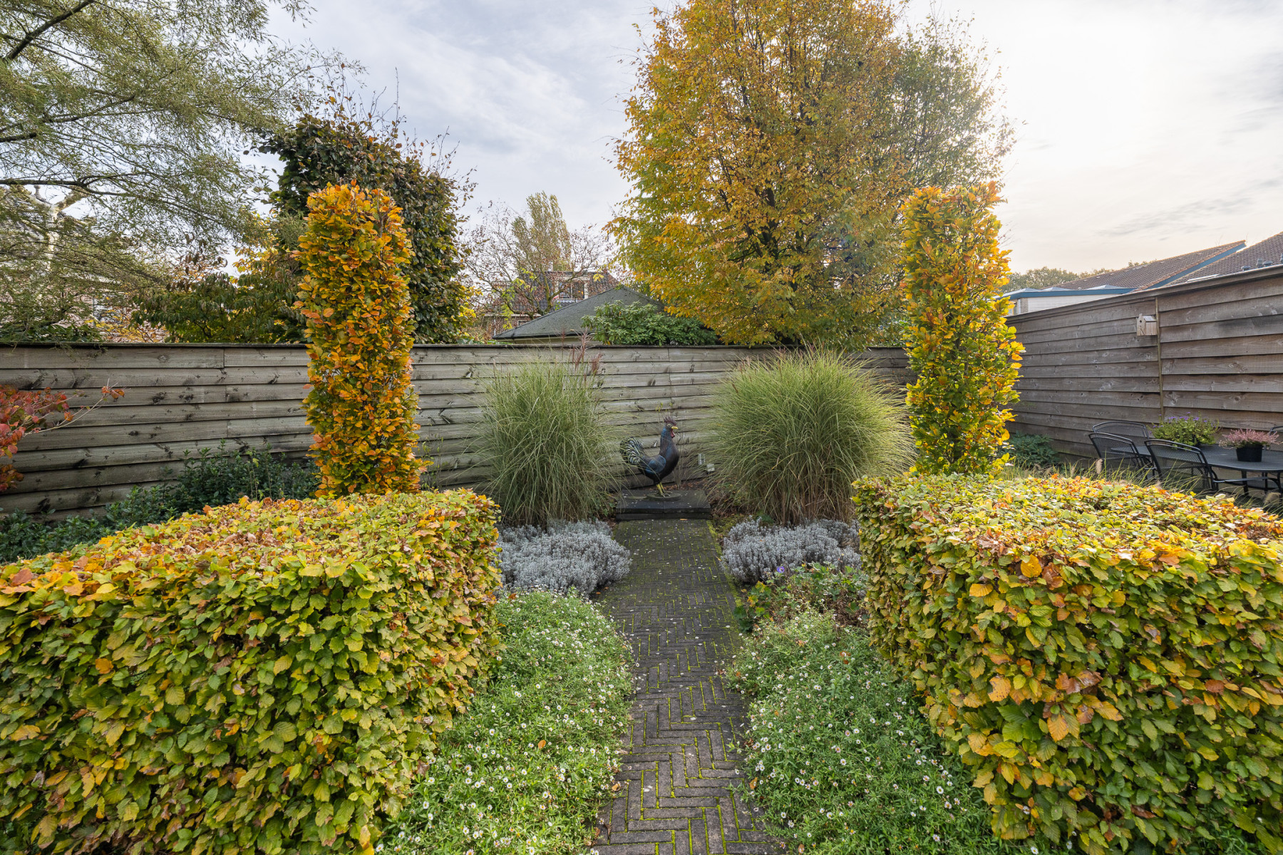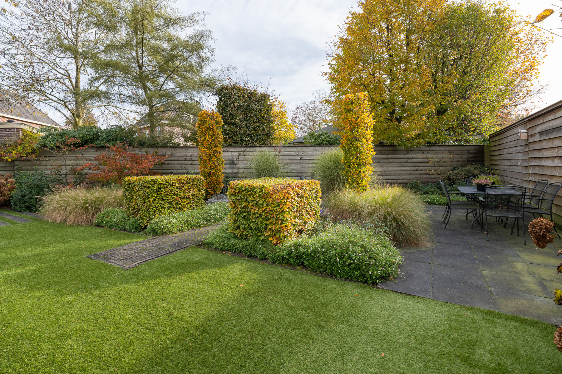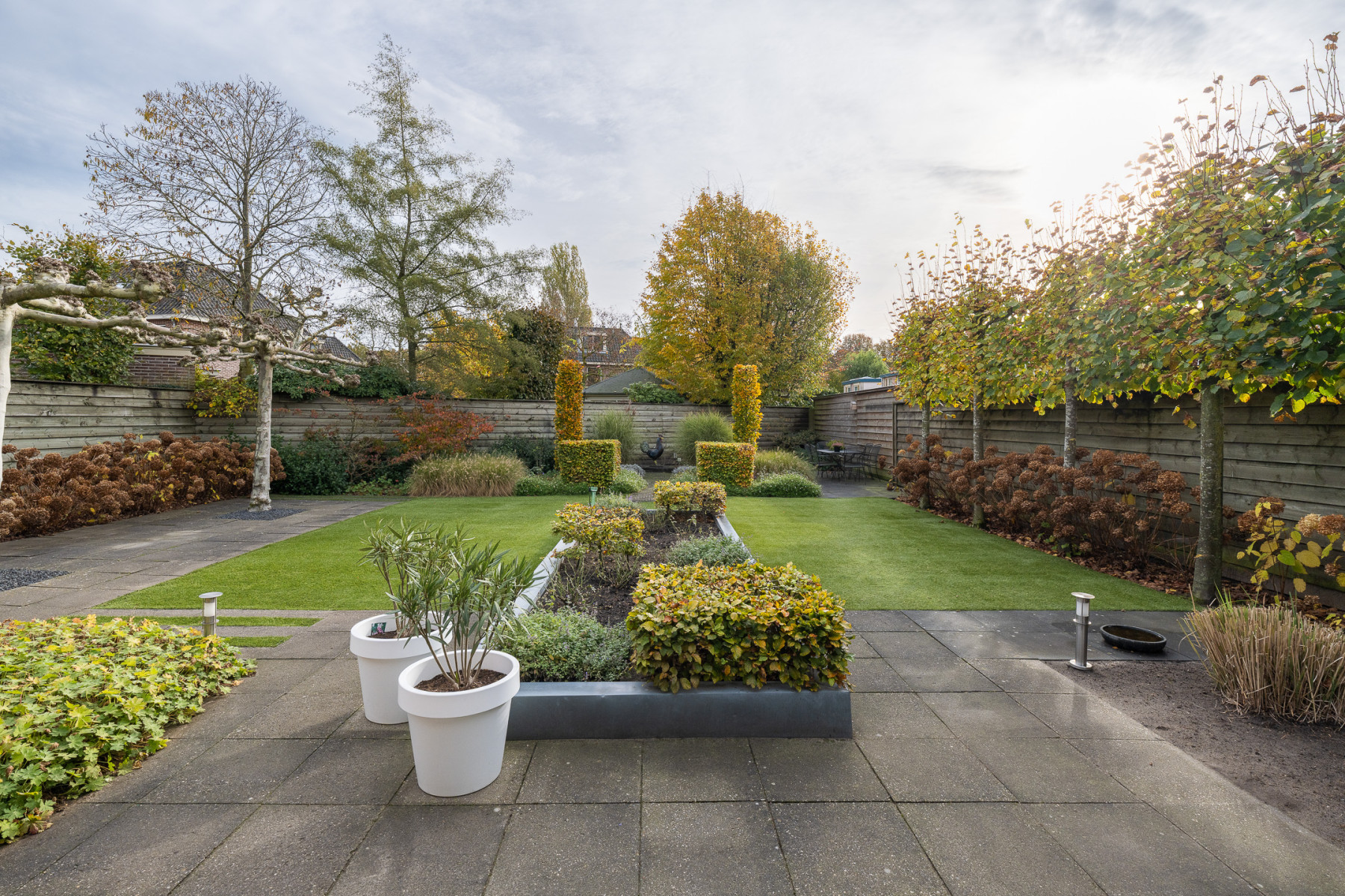 Deze ruime tuin is werkelijk met zorg aangelegd, aan alles is gedacht en dat is echt te zien. De tuin is speels ingedeeld met strakke hagen, diverse beplanting, bestrating en een groot gazon van kunstgras die heel onderhoudsvriendelijk is. Langs de randen staan verschillende leilindes waardoor u van veel privacy geniet in deze tuin. Een plek in de zon of een plek in de schaduw, in deze tuin is het allemaal mogelijk. De tuin biedt u diverse terrassen waar u een leuke zithoek kunt plaatsen. Ook beschikt de tuin over een overkapping, die zich aan de woning bevindt. De overkapping met spotjes is voorzien van een prachtige lichtstraat, wat zorgt voor veel daglicht. En als u hier zit, kijkt u prachtig uit over de tuin. Is het een zonnige dag? Plaats het warmtewerend doek voor de lichtstraat en ook dan kunt u hier fijn genieten. Dankzij de twee terrasverwarmers kunt u hier ook op minder mooie dagen goed vertoeven. De tuin is verder voorzien van een buitenkraan, een druppelslang, verlichting en diverse elektrapunten. Een tuin die tot in detail klopt: ruim, groen en praktisch ingedeeld voor een optimaal buitenleven.