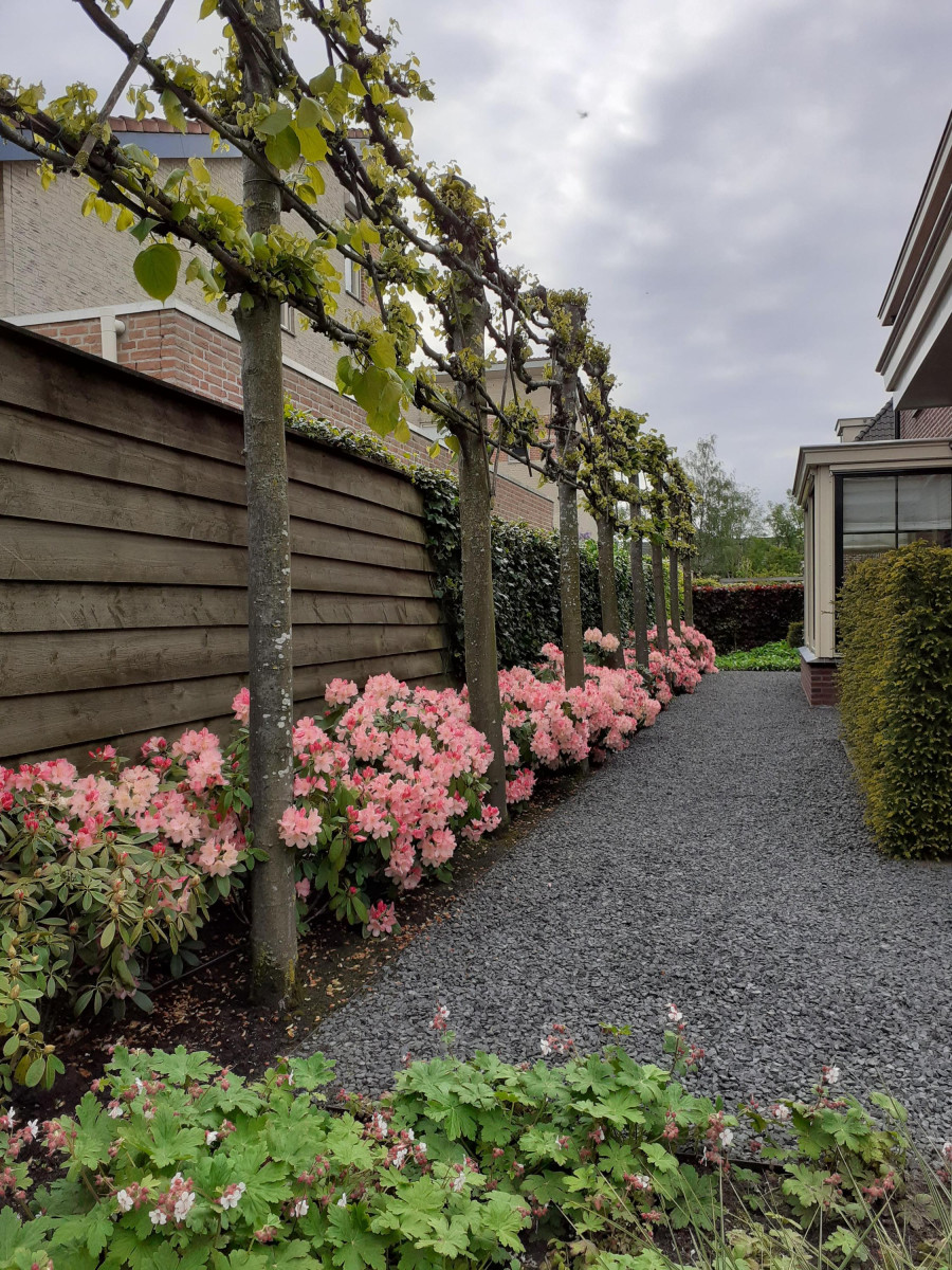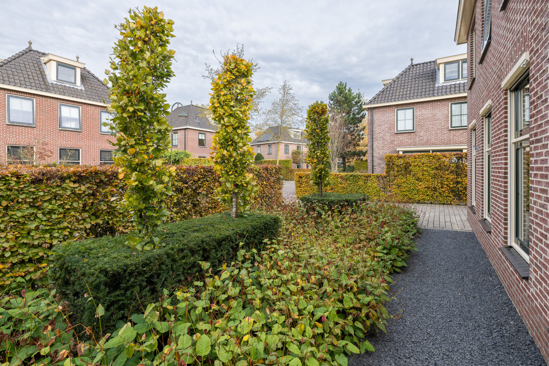 Via de zijkant van de woning lopen we verder naar de voortuin. Ook deze is met zorg aangelegd. In de voortuin treft u diverse beplanting, taxussen en grindpad.